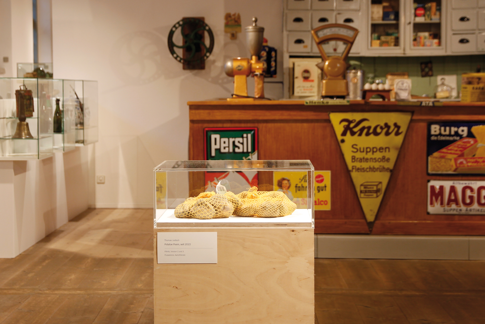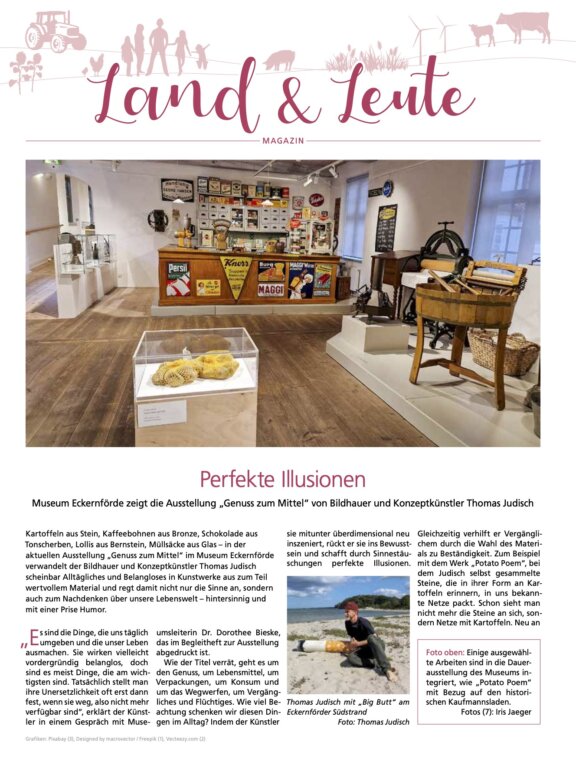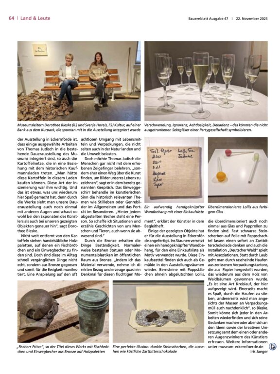 Der Bildhauer und Konzeptkünstler Thomas Judisch (geb. 1981) widmet sich in seiner Ausstellung Themen des Alltags und scheinbar belanglosen Dingen unserer Lebenswelt. Hintersinnig und mit einer Prise Humor appelliert er an unsere Vorstellungskraft und hinterfragt die klassischen Genres in der Kunst. Lollis aus Bernstein, Fischbrötchen aus Bronze, Müllsäcke aus Glas – Thomas Judisch entwirft gleichsam Bilder unseres Lebens.