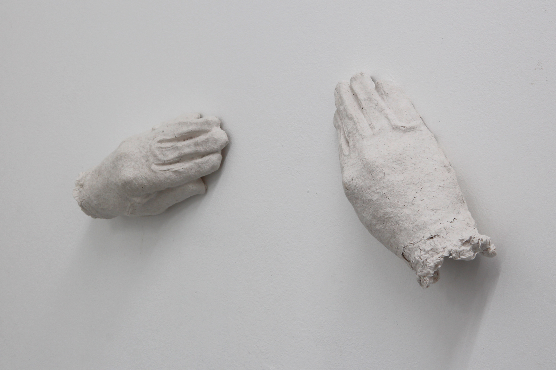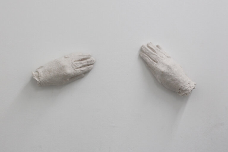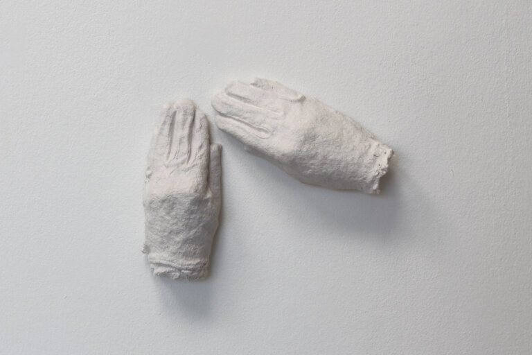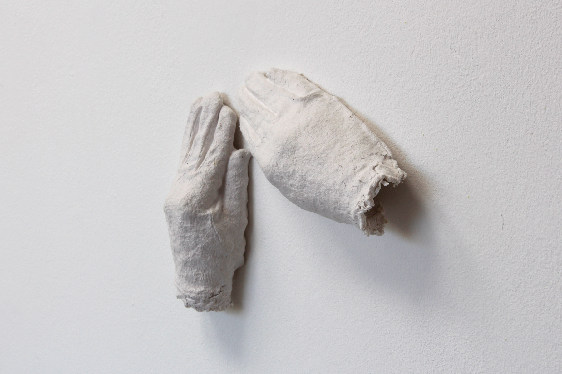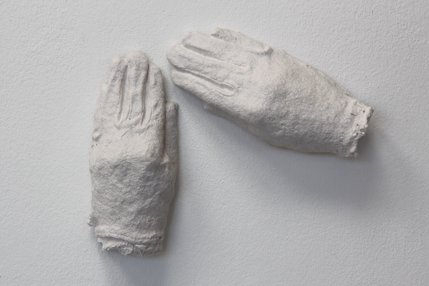 The work „Handle with Care“ can be understood as a continuation of series „The Last Shirt“ and „Down to the Skin.“ In these works the process of material transformation plays a central role: The starting material is first cut and shredded to create pulp. From this pulp, the artist then re-forms the original object — white gloves, such as those typically worn when handling artworks properly. This transformation creates a reflexive cycle between material, form, and function, raising questions about protection, touch, and the artistic engagement with the work.