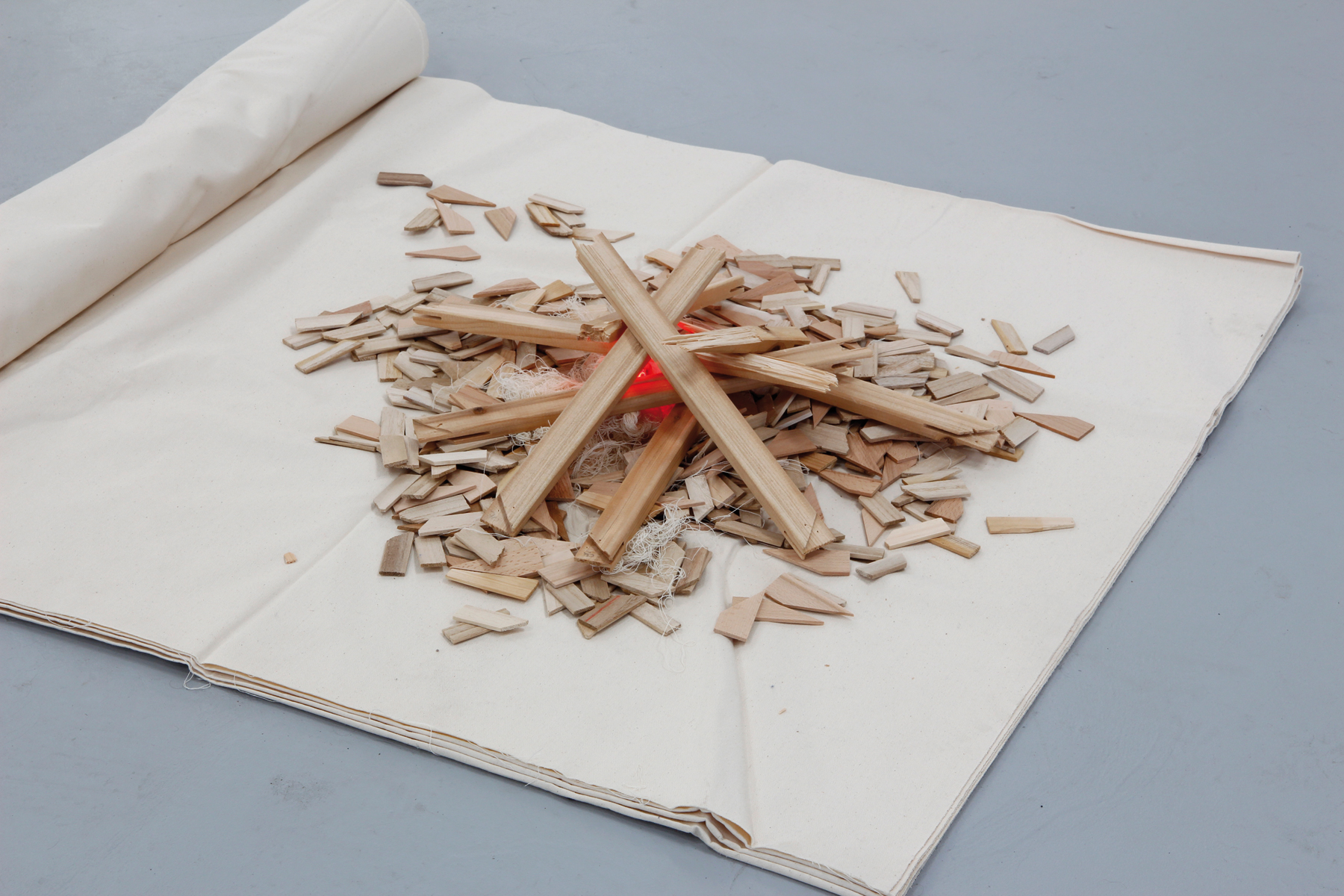 What is depicted is not the blazing fire, but rather the image of a campfire with regard to its beginning and the gathering around such a fire that is generally associated with it. Variations of such a situation are placed around the space — executed in various materials that can be fired or burned, such as bronze, ceramic and paper. The viewer of ‚Round Table‘ completes the notion of assembly through his — in this case actually tangible —physical presence.